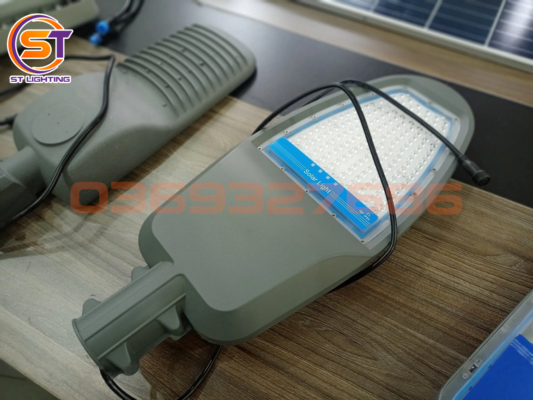 – Hệ thống quang học của thiết bị quy tụ nhiều chip LED SMD. Khoảng cách giữa mỗi chip LED đều được tính toán cẩn thận. Bao bọc phía trước mắt LED là mặt kính trong suốt chịu lực. – Ở đây, đèn sử dụng điện năng lượng mặt trời. Tấm panel 80W có nhiệm vụ thu về bức xạ rồi biến đổi thành điện năng. Nguồn điện được sạc vào bộ lưu điện pin Lithium sắt phốt phát. Điện áp danh định là 12.8V, dung lượng ở mức 40AH.