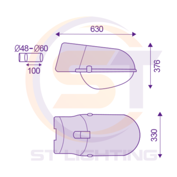 - Đèn lắp vào cần nằm ngang từ Ø48 – Ø60, sâu 100mm, góc nghiêng đèn theo thiết kế.